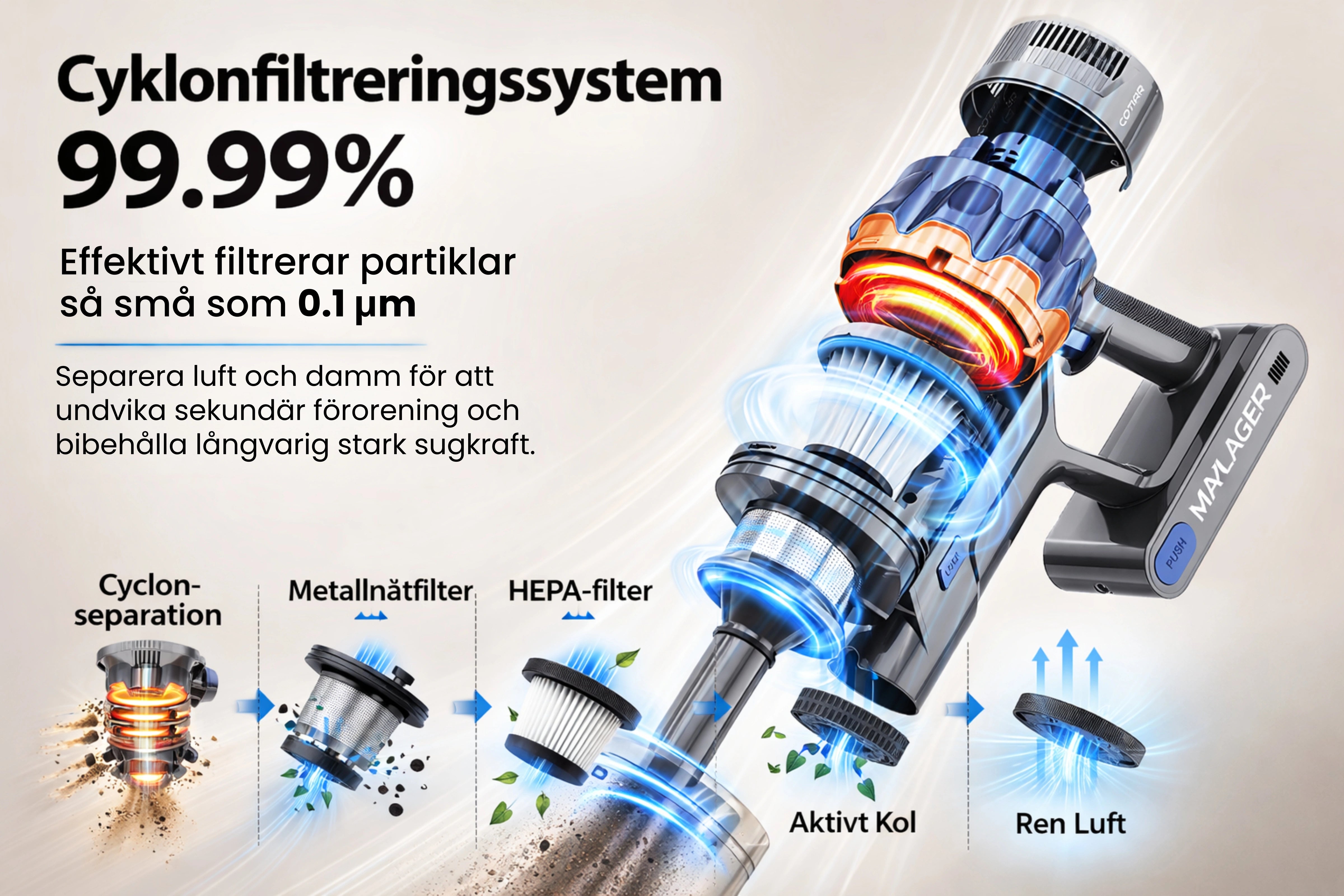 Flerstegs cyklonfiltrering och HEPA