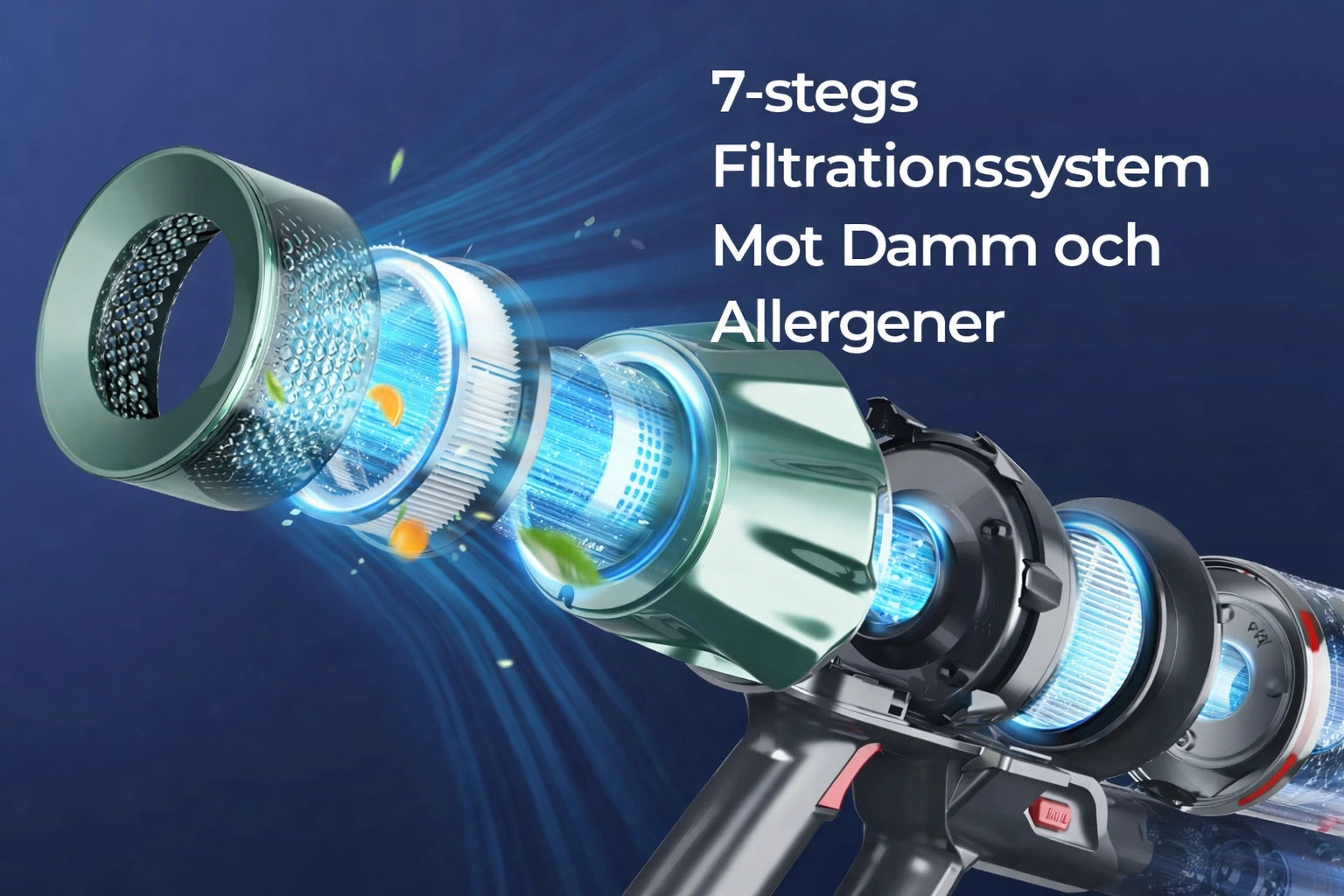 Det avancerade 7-stegs filtersystemet med dubbla HEPA-filter fångar upp till 99,97 % av damm och allergener och hjälper till att hålla utblåsluften renare, särskilt uppskattat i hem med husdjur eller för dig som är känslig mot damm.